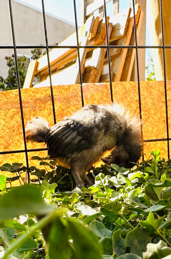 Mercy after dust bathing. It’s how chickens keep themselves clean, but she looks dirtier than when she began.