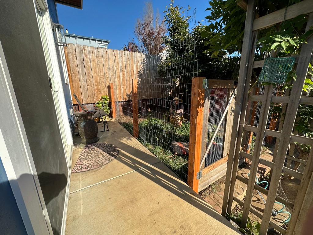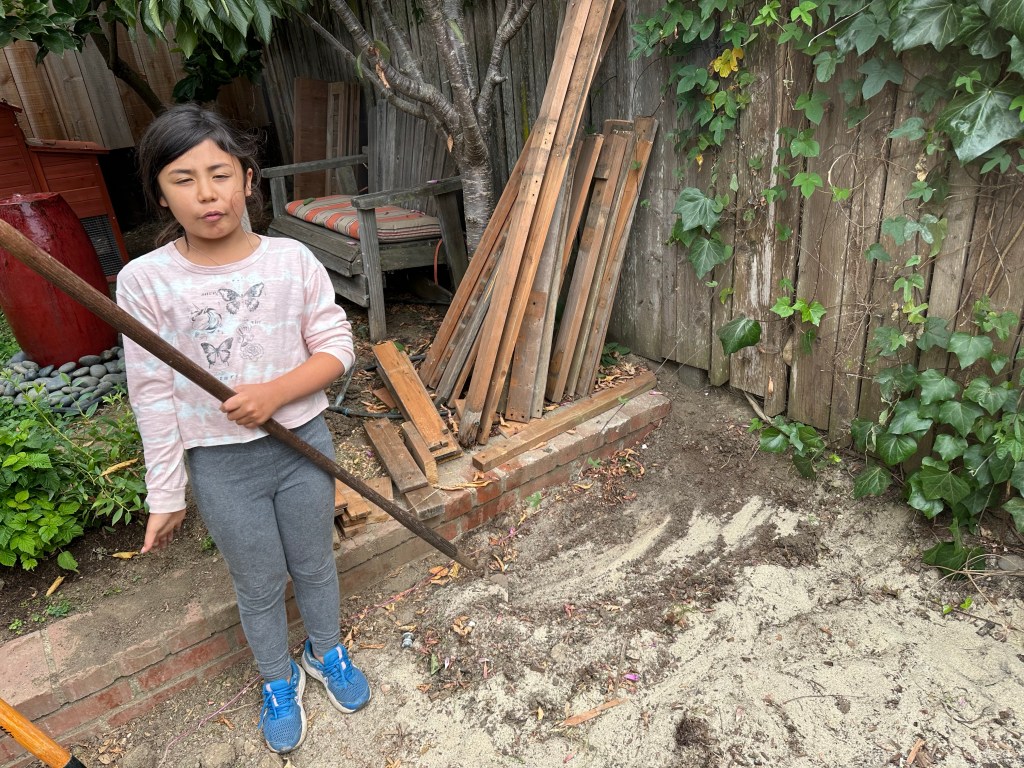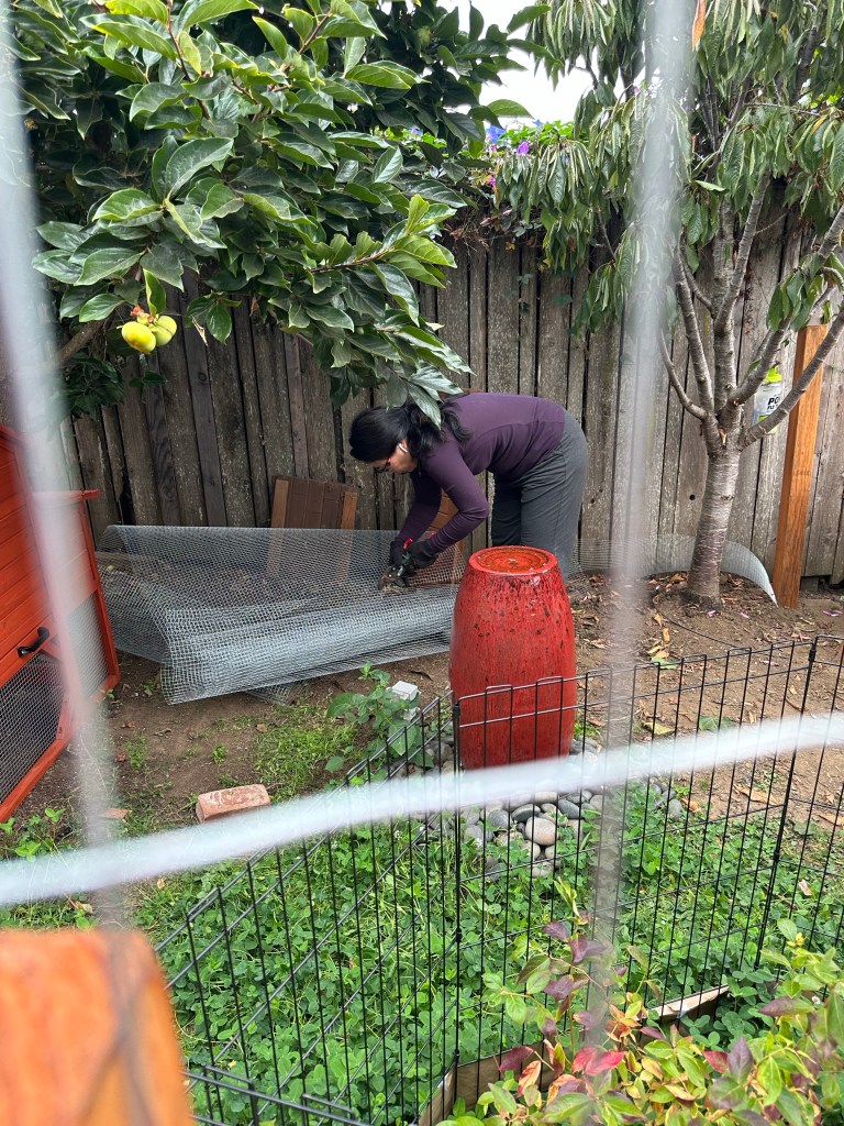 Here I am unfurling some hardware cloth to rat-proof the compost bin. It’s nasty to work with! Got poked and scratched everywhere.