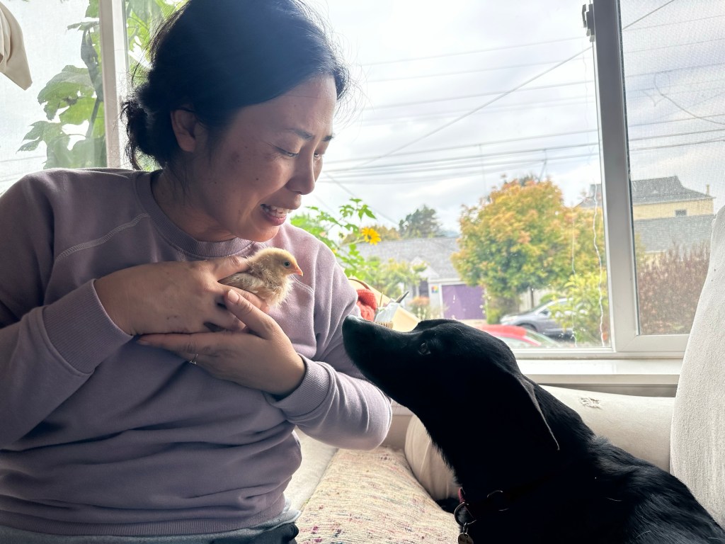 Baobao is quite tense around the chicks. Maybe because he’s a wild dog with a strong prey drive. Maybe because I growl when he gets too close or stares too long.