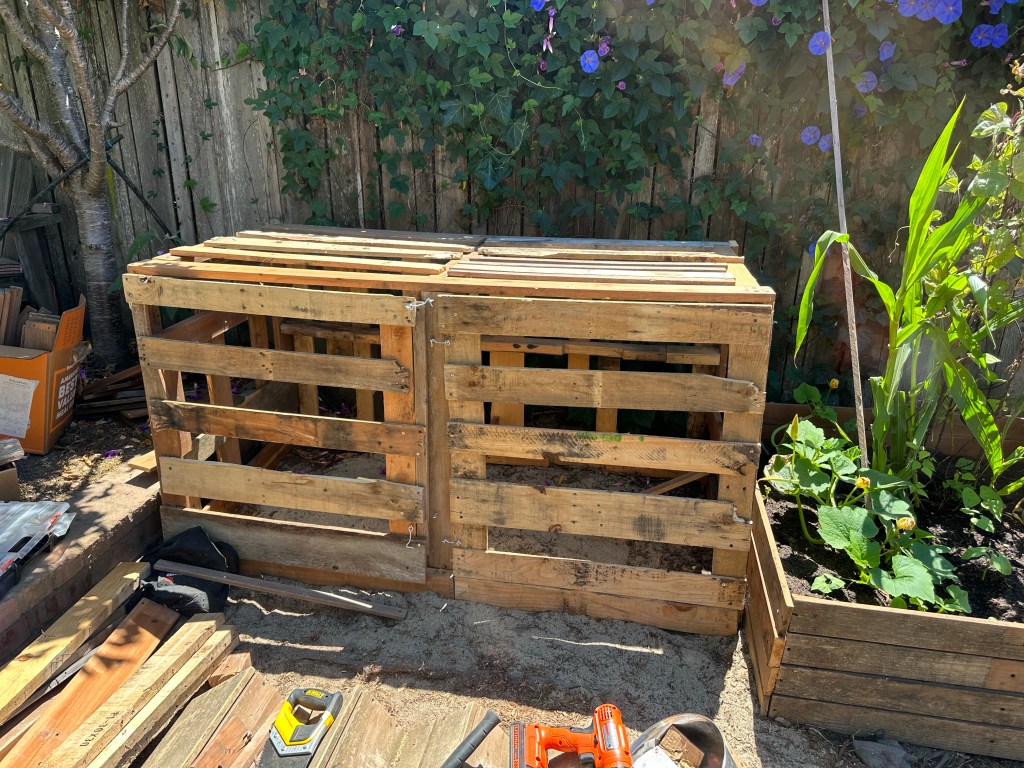 My first construction project in a long, long time, that took a long, long time to finish: a double compost bin. The frame is mostly out of redwood from the playhouse, the rest scrap wood from free pallets. Most of the hardware was recycled. The sides and tops are hinged for easy dumping and harvesting.