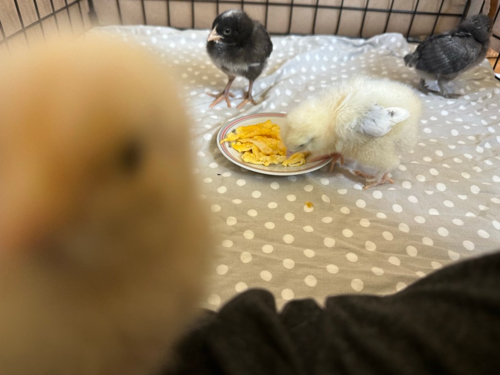 In subsequent days, though, I struck out. First it was scrambled eggs. Don’t be shocked—it’s not cannibalism! Chicks are literally nourished by the contents of their egg before hatching. So when they’re very young, or ill, an egg gently scrambled in the tiniest bit of oil is supposedly a wonderful thing. But my chicks had not read the internet, and weren’t at all interested in the egg.