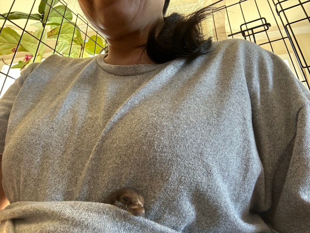 She really enjoyed taking a warm nap in my makeshift Birdie Bjorn. I might have imagined it, but the other chicks looked jealous.