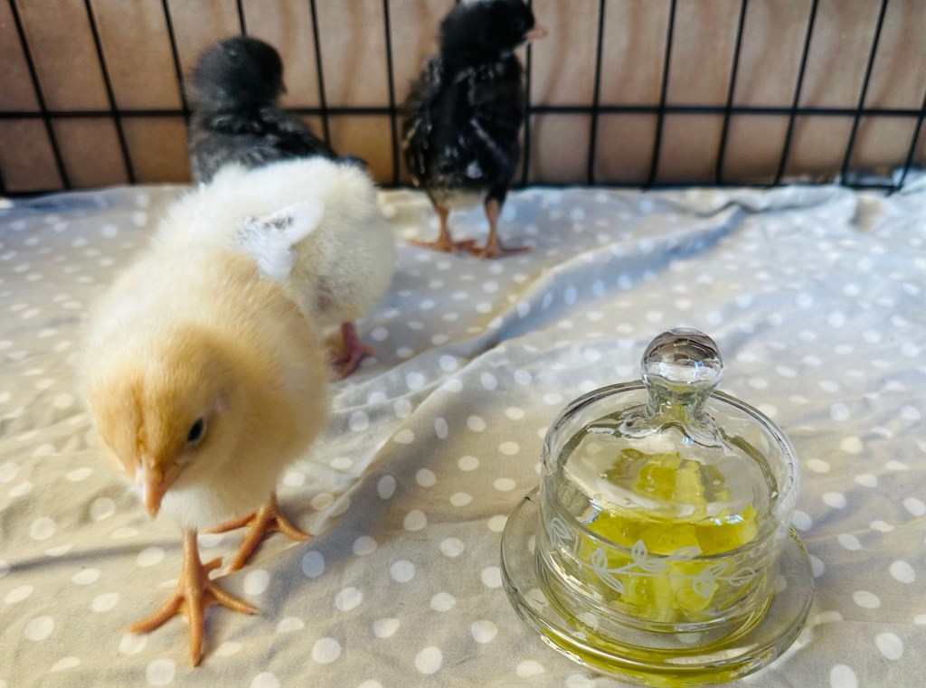 To continue taming the chicks, I try to offer little treats in my hand. The first few times, I just soaked their regular chick feed in water. According to the internet, chicks go wild for soaked feed. And as it’s literally their food and water, they’re nothing unsafe about offering it even to the youngest babies.