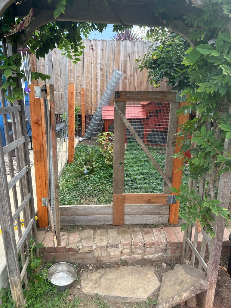 Last, a gate for the chicken yard. Thanks to my DIY-handy neighbors Leslie and Jim, I had plenty of scrap wood to add to my stash, making for a unique but functional and sturdy gate.