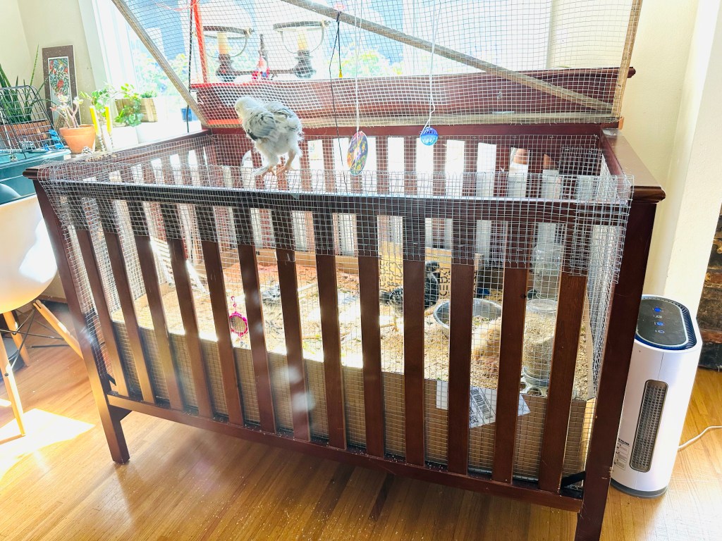While all this was going on, our chicks outgrew their brooder box. I could see they were getting restless. Online, I saw the idea for repurposing a (human) baby’s crib as a larger brooder.